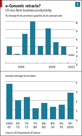 The announcement on May 8th that America's productivity declined in the first quarter of 2001 at an annual rate of 0.1%, compared with growth of more than 5% during the year to June 2000, is a blow for the IT-powered new economy. One by one, its claims to be special are being exposed as myths. Now it seems that the widely-held belief that America's sustainable rate of productivity growth had doubled to around 3% was also mere myth. That does not mean, however, that the new economy was entirely hot air. Its cheerleaders have certainly been muffled this year by the plunge in the Nasdaq high-tech stockmarket index, by the collapse of dotcom firms, by the slump in the profits of Internet giants such as Cisco (which this week reported its first quarterly loss in 11 years and a 30% decline in sales), and by signs that the American economy may be heading into recession. The new-economy sceptics, who long argued that computers and the Internet did not rate in the same economic league as electricity or the car, are now grinning smugly. They have a long list of unfulfilled promises to point to. Top of the list is the idea that the traditional business cycle is dead. Now that America's economy is slowing sharply and unemployment is rising, everybody is trying to deny that they ever made such a claim. Instead, they argue that IT helps to smooth the cycle. But even that claim looks suspect: if America's GDP growth this year slows to the average forecast of 1.5%, then the decline in growth from 5% last year would be very abrupt indeed. And because of the excesses that have built up during the boom years-such as too much investment and too little saving-there is a high risk that the downturn could be much deeper. If America's GDP growth were to fall below 1% this year, it would be the sharpest slowdown between any two years since the 1974-75 oil crisis. So much for smoothing. Producerad av